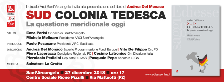 SALUTI Enzo Parisi Sindaco di Sant’Arcangelo Michele Molinaro Presidente ARCI Sant’Arcangelo INTRODUCE Paolo Pesacane Presidente ARCI Basilicata DISCUTONO Andrea Del Monaco Esperto Programmazione Fondi Europei | Vito De Filippo On. PD Piero Lacorazza Consigliere Regionale PD | Cosimo Latronico On. Direzione Italia Piernicola Pedicini Deputato UE M5S | Pasquale Pepe Senatore LEGA MODERA Salvatore La Grotta