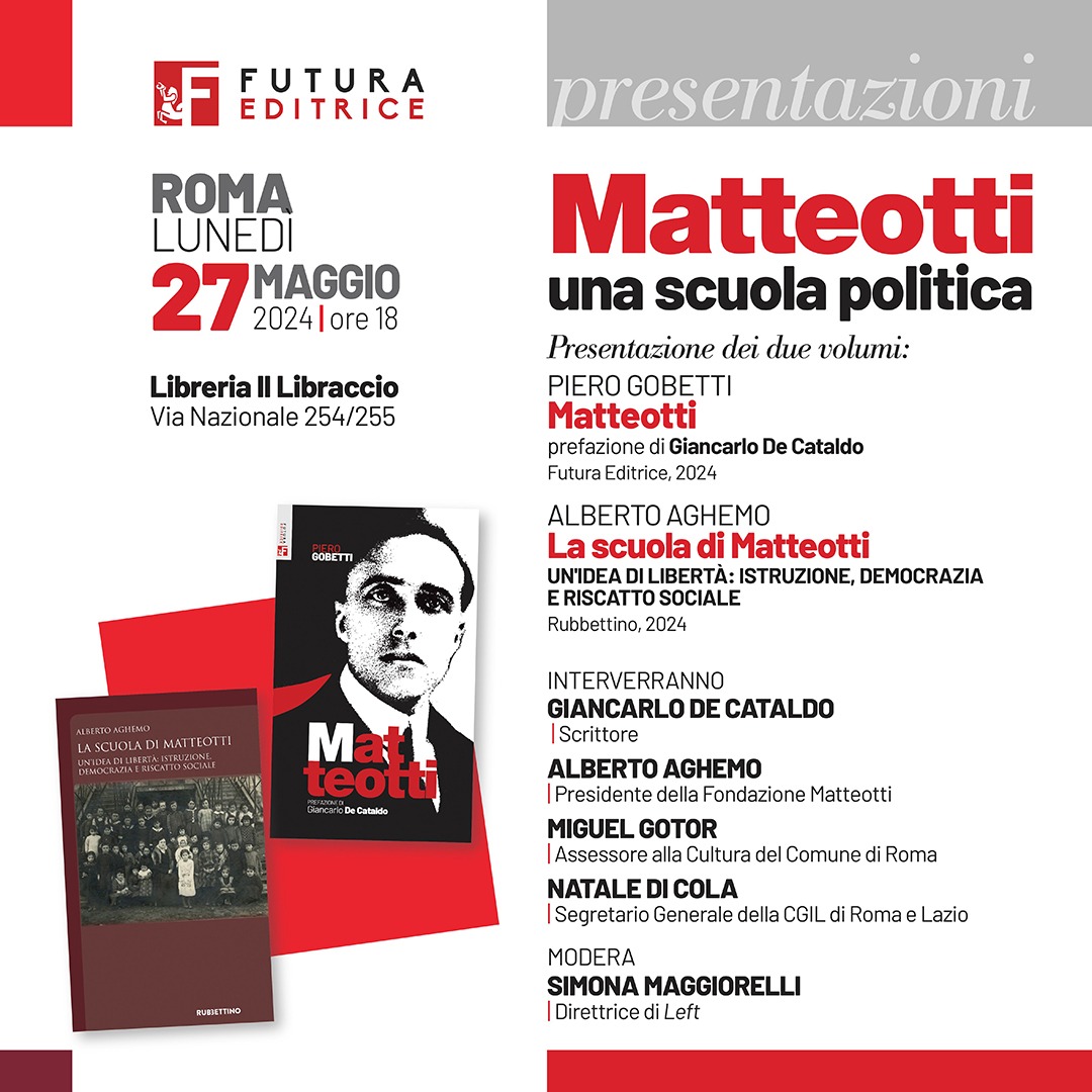 Matteotti dopo un secolo Gallery Matteotti dopo un secolo News Matteotti dopo un secolo Lunedì 27 maggio alle ore 18, presso il Libraccio in via Nazionale, Roma, la presentazione del volume "Matteotti", il celebre scritto di Piero Gobetti ripubblicato da Futura editrice. Con noi [...]